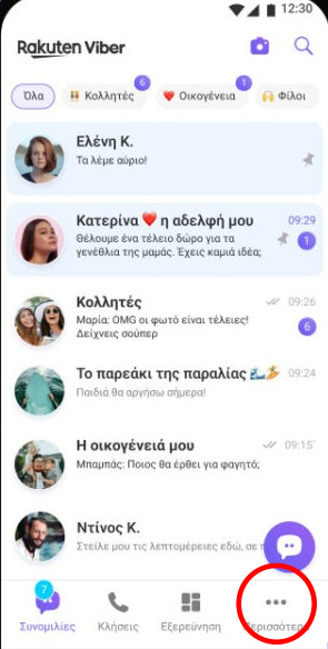 Ανοίξτε το Viber στο κινητό σας, στην κεντρική σελίδα της εφαρμογής. Eπιλέξτε κάτω δεξιά το "περισσότερα" (τρεις τελείες). Θα οδηγηθείτε στη σελίδα του προφίλ σας.