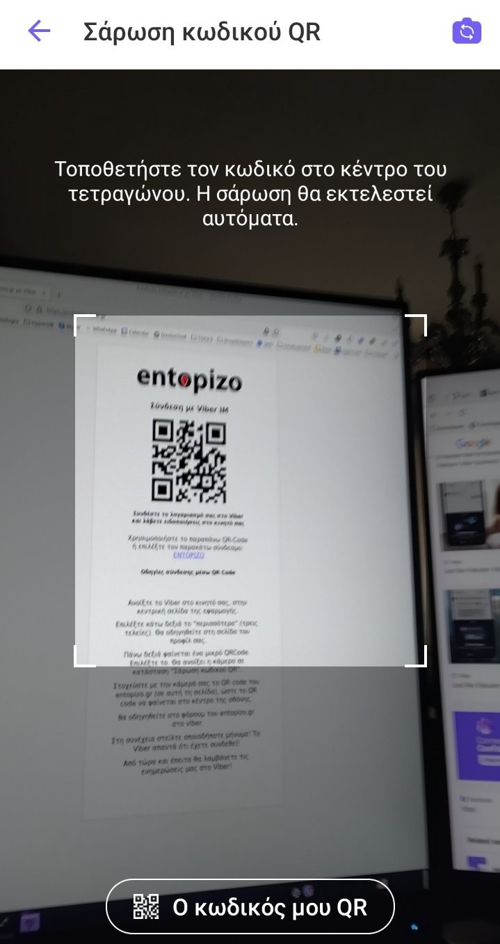 Στοχεύστε με την κάμερά σας το QR code του entopizo.gr (σε αυτή τη σελίδα), ώστε το QR code να φαίνεται στο κέντρο της οθόνης. Μόλις το κάνετε θα οδηγηθείτε στη σελίδα του entopizo.gr στο Viber.